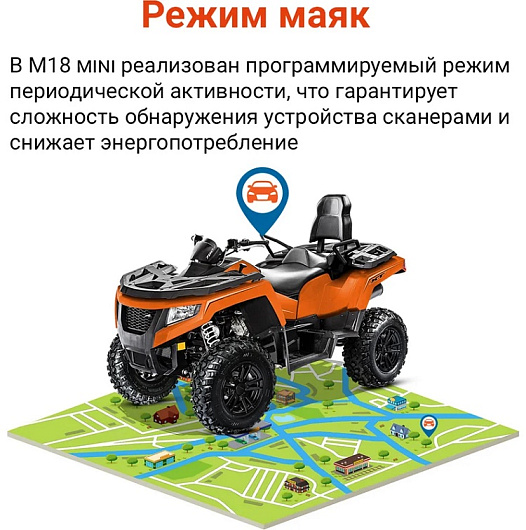 - Режим маяк – В М18 mini реализован программируемый режим периодической активности, что гарантирует сложность обнаружения устройства сканерами и снижает энергопотребление;
