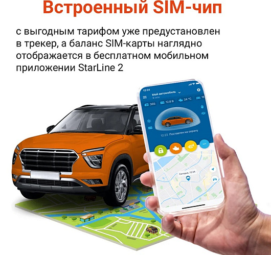 - Встроенный SIM-чип с выгодным тарифом уже предустановлен в трекер, а баланс SIM-карты наглядно отображается в бесплатном мобильном приложении StarLine 2;
