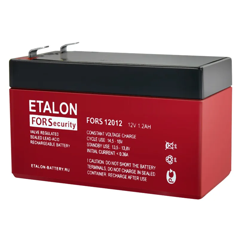 Аккумулятор 12 В 1,2 Ач, габариты 98*44*59 мм. Используется на малых токах разряда, преимущественно в буферном режиме. Основное применение: системы аварийного освещения, охранной и пожарной сигнализаций, контроля и управления доступом, портативная аппаратура, весы и ККМ. Не предназначен для работы в составе ИБП. Аккумулятор ETALON FORS 12012 является стационарным свинцово-кислотным необслуживаемым и изготовлен по технологии AGM. Серия FORS спроектирована под применение в охранных и пожарных системах, системах освещения, контроля и доступа персонала. Отличительная особенность – высокое качество и оптимальная цена для этого целевого использования.