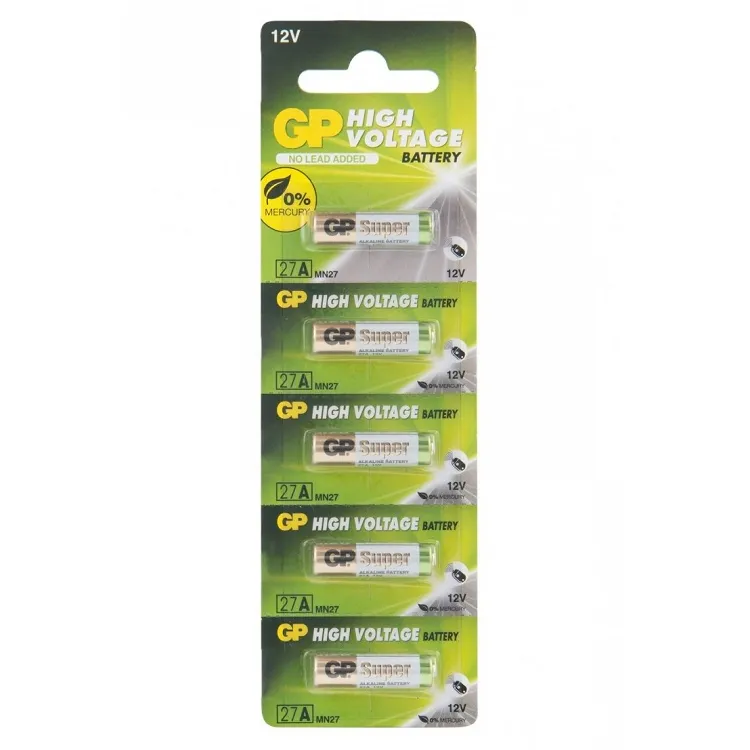 Алкалиновые батарейки GP 27A, напряжение — 12 В, номинальная емкость — 20 мАч. Обладают повышенной электрической емкостью, изготовлены из экологически чистых материалов без содержания ртути и кадмия. Подходят для устройств с высоким потреблением энергии.