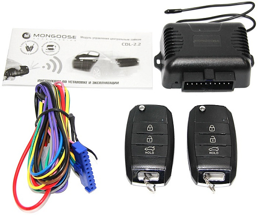 Mongoose CDL-2.2 - блок дистанционного управления центральным замком для дистанционного запирания/отпирания дверей и дистанционного отпирания багажника. В комплекте два брелка с заготовками выкидного ключа.