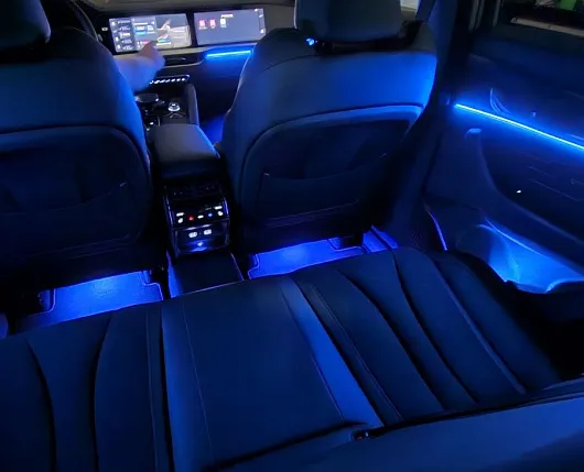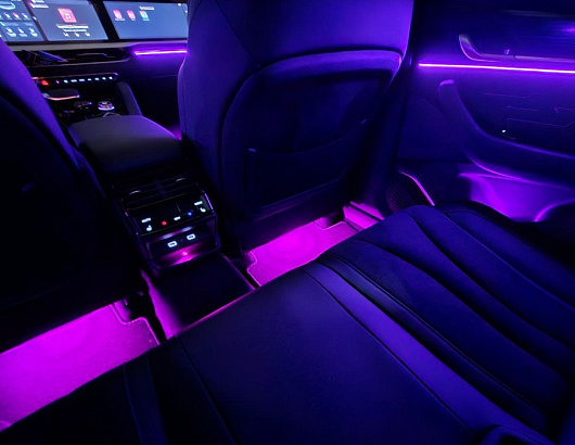 Существует широкий выбор цветов и режимов работы от мягкой и расслабляющей голубой до яркой и энергичной красной, при этом лента может регулироваться как одновременно на всех частях авто, так и по отдельности для контура подсветки ног, дверей и торпеды, ручек и карманов.