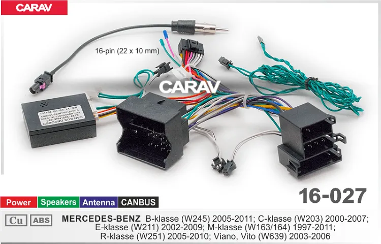 Комплект проводов для подключения Android Carav 16-027 представляет собой специальное приспособление, с помощью которого можно легко заменить штатную акустическую систему в MERCEDES-BENZ выпуска 2005-2011 любой другой автомагнитолой, типоразмеров 1DIN, 2DIN, 9", 10.1" дюймов. Достоинством Carav 16-027 является отсутствие необходимости вмешиваться в проводку авто – резать провода, а затем соединять их. В переходнике предусмотрен разъем, позволяющий соединить штатный вход с одной стороны, а с другой – разъем для Android автомагнитолы.