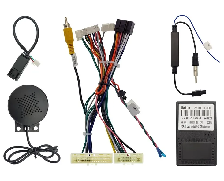 В комплект входят основной комплект проводки с CANBUS адаптером, антенный переходник и переходник для штатного USB разъема, переходник для штатной камеры заднего вида, динамик для предупреждающего сигнала штатных датчиков парковки.