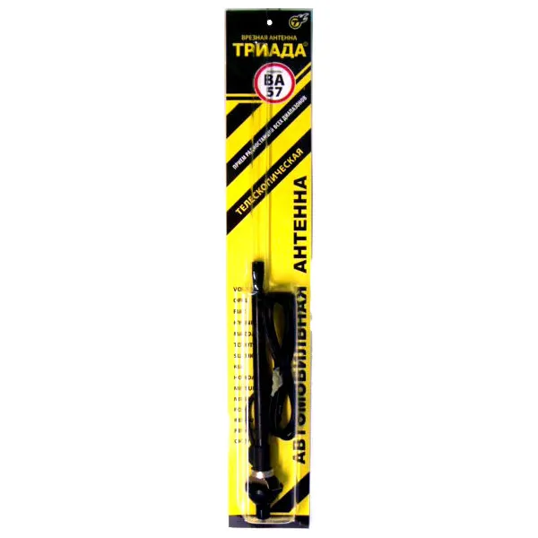 Модификации: "Триада - ВА 57 В" (черный пруток), "Триада - ВА 57 Н" (никелерованный блестящий пруток). Конструкция позволяет адаптировать антенну к месту установки, угол установки антенны относительно корпуса - 0-20градусов от вертикального положения.