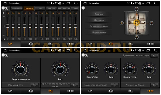 - Настройки звука 8 предустановок, 13-полосный эквалайзер, 5 зон баланса звука, доп. настройки DSP