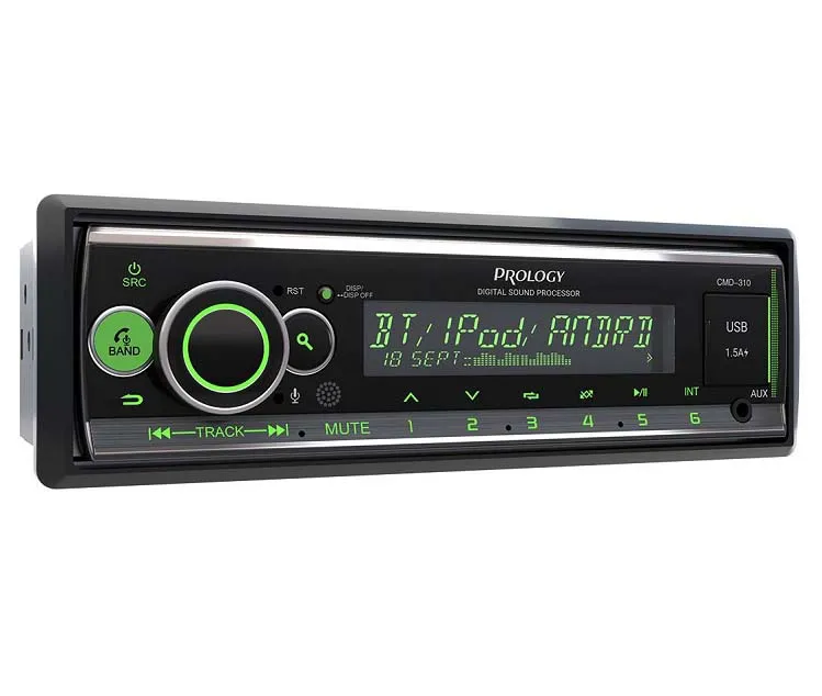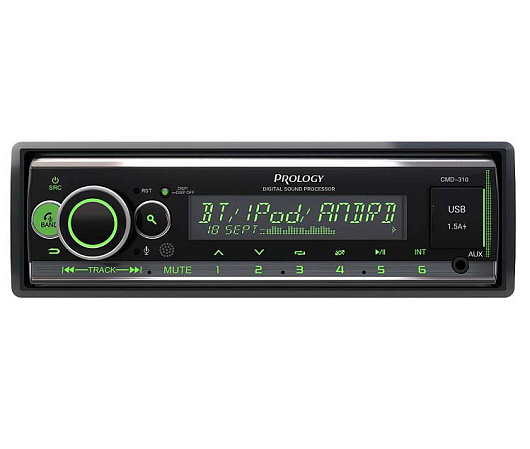 PROLOGY CMD-310 — FM / USB ресивер с Bluetooth и встроенным DSP - аудиопроцессором, стандартного размера 1DIN, который обеспечивает прием радиостанций в диапазоне FM / УКВ / AM и воспроизведение медиафайлов MP3, WAV, и FLAC форматов, записанных на USB накопители, передачу звука с внешних источников через линейный аудиовход и беспроводной интерфейс Bluetooth. Поддерживается управление мобильным телефоном через интерфейс Bluetooth (ver. 4,2).