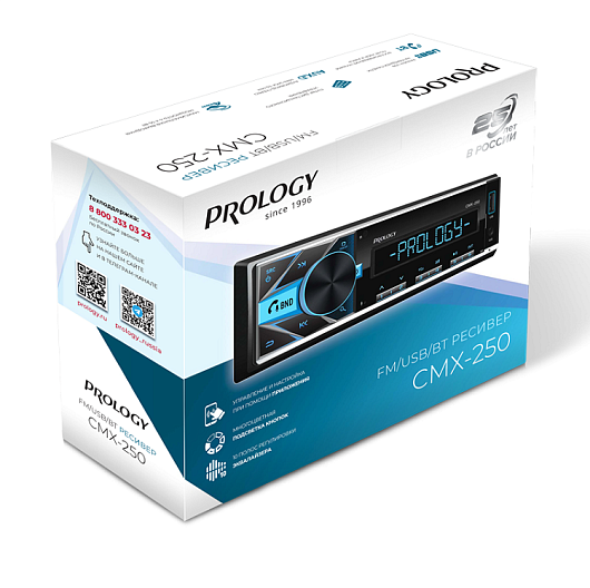 PROLOGY CMX-250 — FM / USB ресивер с Bluetooth, стандартного размера 1DIN, который обеспечивает прием радиостанций в диапазоне FM и воспроизведение медиафайлов MP3, WAV, и FLAC форматов, записанных на USB накопители, передачу звука с внешних источников через линейный аудиовход и беспроводной интерфейс Bluetooth. Поддерживается управление мобильным телефоном через интерфейс Bluetooth (ver. 4,2).