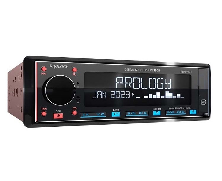 PROLOGY PRM-100 — FM / USB ресивер с Bluetooth и встроенным DSP - аудиопроцессором, стандартного размера 1DIN, который обеспечивает прием радиостанций в диапазоне FM / УКВ и воспроизведение медиафайлов MP3, WAV и FLAC форматов, записанных на USB накопители, передачу звука с внешних источников через линейный аудиовход и беспроводной интерфейс Bluetooth. Поддерживается управление мобильным телефоном через интерфейс Bluetooth (ver. 4,2).