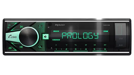 PROLOGY CMX-250 — FM / USB ресивер с Bluetooth, стандартного размера 1DIN, который обеспечивает прием радиостанций в диапазоне FM и воспроизведение медиафайлов MP3, WAV, и FLAC форматов, записанных на USB накопители, передачу звука с внешних источников через линейный аудиовход и беспроводной интерфейс Bluetooth. Поддерживается управление мобильным телефоном через интерфейс Bluetooth (ver. 4,2).