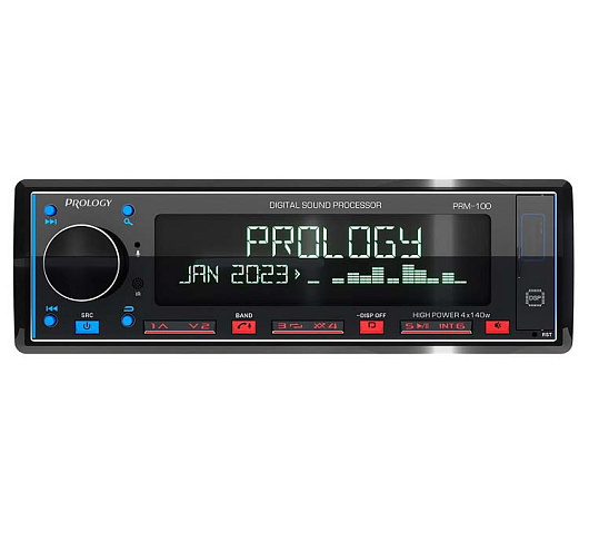 PROLOGY PRM-100 — FM / USB ресивер с Bluetooth и встроенным DSP - аудиопроцессором, стандартного размера 1DIN, который обеспечивает прием радиостанций в диапазоне FM / УКВ и воспроизведение медиафайлов MP3, WAV и FLAC форматов, записанных на USB накопители, передачу звука с внешних источников через линейный аудиовход и беспроводной интерфейс Bluetooth. Поддерживается управление мобильным телефоном через интерфейс Bluetooth (ver. 4,2).
