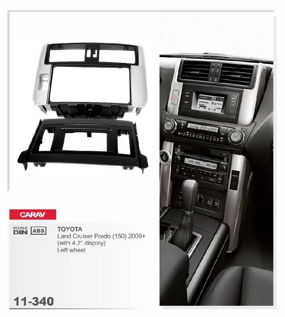 Carav 11-340 - это автомобильная монтажная рамка черно-серебристого цвета. 11-340 выполнена из пластика ABS. Переходная рамка предназначена для установки автомагнитолы стандартного размера 2-DIN вместо штатного головного устройства. Carav 11-340 совместима с автомобилями Toyota Land Cruiser Prado (150) 2009-2013 c дисплеем 4.2 дюйма и рулем слева.
