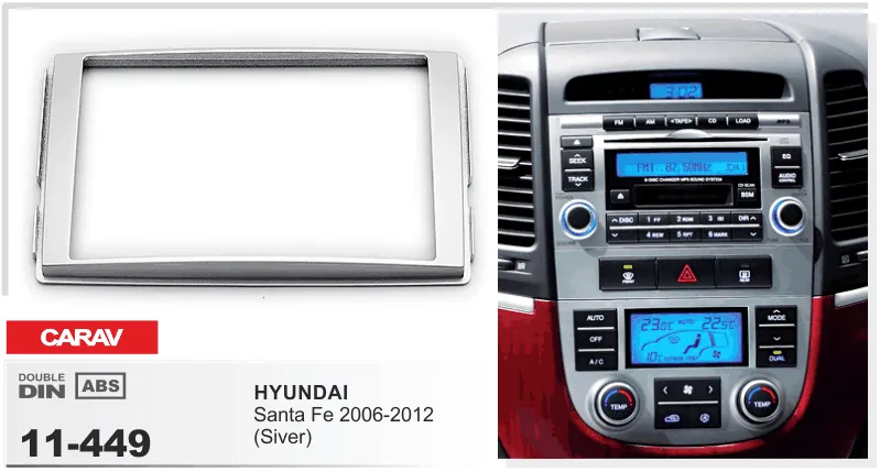 Carav 11-449 - это автомобильная монтажная рамка серого цвета. 11-449 выполнена из пластика ABS. Переходная рамка предназначена для установки автомагнитолы стандартного размера 2-DIN вместо штатного головного устройства. Carav 11-449 совместима с автомобилем Hyundai Santa Fe 2006-2012 (Silver).