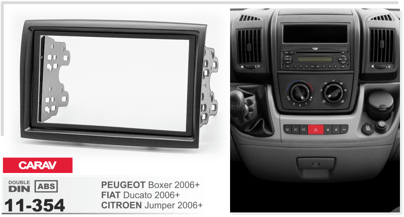 Carav 11-354 - это автомобильная монтажная рамка черного цвета. 11-354 выполнена из пластика ABS. Переходная рамка предназначена для установки автомагнитолы стандартного размера 2-DIN вместо штатного головного устройства. Carav 11-354 совместима с автомобилями Citroen Jumper (2006+), Peugeot Boxer (2006+) и Fiat Ducato (2006+).