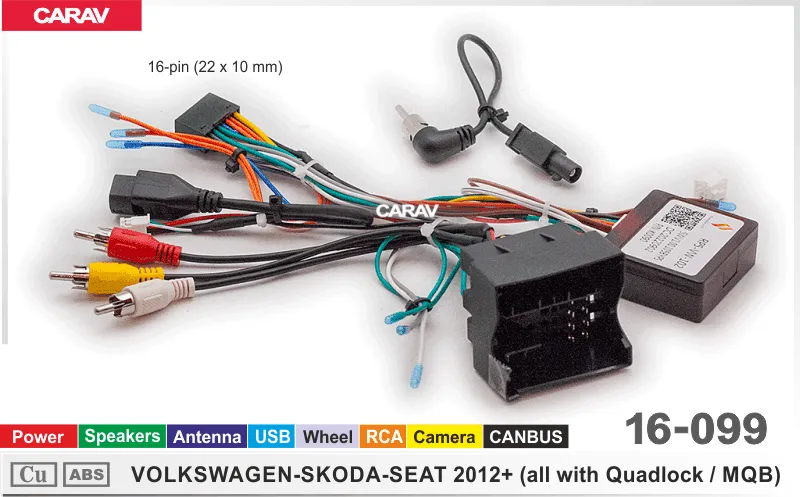 SKODA - 2012+. Комплект проводов для подключения Android ГУ (16-pin) / MQB / Power + Speakers + Antenna + Wheel + USB + 2RCA + Camera + CANBUS