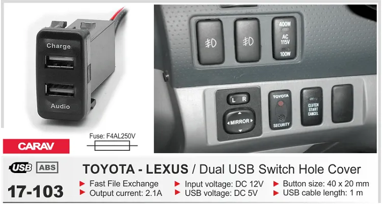 CARAV 17-103: USB разъем в штатную заглушку для а/м TOYOTA - LEXUS / 2 порта: аудио + зарядное устройство