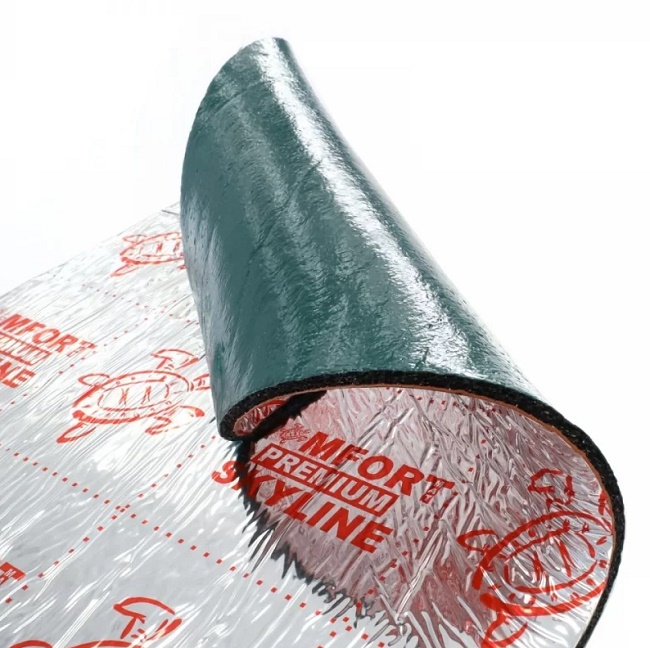 Comfort Mat SKYLINE (второй слой) — это самая легкая мембранная звукоизоляция, которая выполнена на современном монтажном клее-герметике. Рабочая часть шумоизоляционного материала состоит из шумоизоляционной прослойки, накрытой плотной тонкой звукоизоляционной мембраной. Финальный алюминизированный слой позволяет нам получить высокую адгезию для следующего слоя, в качестве которого мы рекомендуем использовать мягкий шумопоглотитель. Мы получаем не только удобство и легкость монтажа, абсолютную влагостойкость, высокую эластичность и адгезию к вертикальным поверхностям, но и самое главное — небывалую среди аналогичных материалов легкость, что даёт нам возможность использовать мембранные материалы на крыше автомобиля.