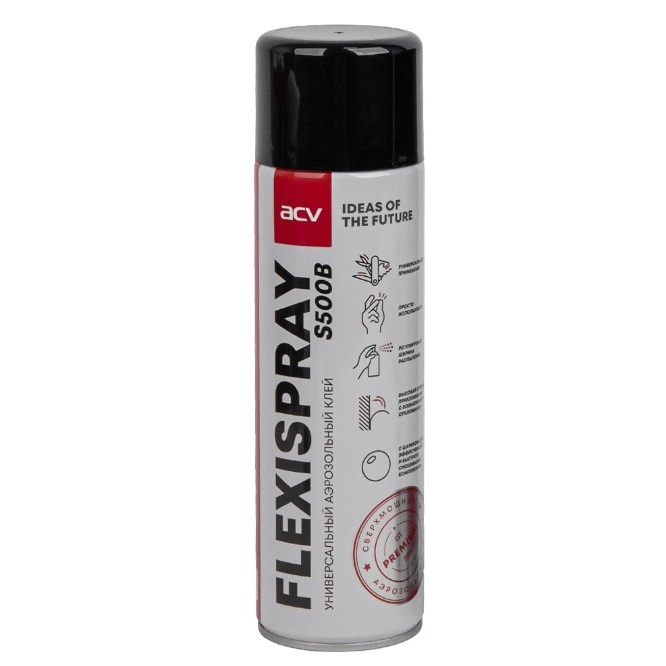 ACV Flexispray S500B – сверхмощный универсальный аэрозольный клей для прочного приклеивания акустического карпета, картона, пластика и других материалов.