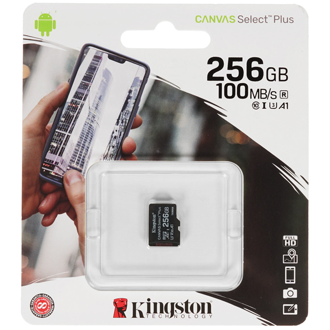 Kingston Canvas Select Plus microSDXC 256 ГБ Карта памяти обладает хорошей вместимостью (256 ГБ) и при этом очень компактным корпусом, подходящим для слотов большинства мобильных устройств Android. Довольно высокий класс скорости (UHS-I (U1)) позволяет использовать данную карту для записи видео в формате FullHD. При этом каждый кадр будет записан максимально точно. Запись на карту памяти происходит со скоростью 85 Мбайт/сек, а считываются все файлы за 100 Мбайт/сек.