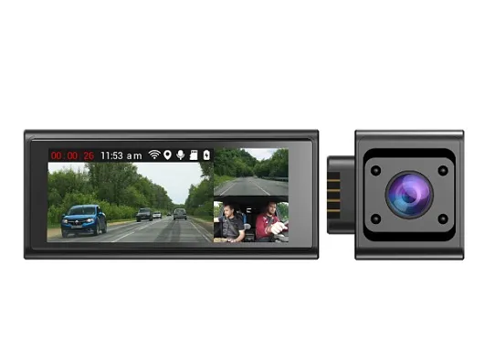 Салонная камера регистратора с углом обзора 110° записывает происходящее в салоне в формате 1080P Full HD. Камера оснащена 4 инфракрасными светодиодными лампами, автоматически активирующимися в зависимости от внешнего освещения и позволяющими записывать качественное видео в салоне автомобиля даже при полной темноте. Устройство идеально подходит для автопарков, такси, автобусов, маршрутных такси и всех, кому необходимо запечатлеть происходящее внутри автомобиля. Если же потребуется конфиденциальность, то салонную камеру можно легко отсоединить от корпуса видеорегистратора.