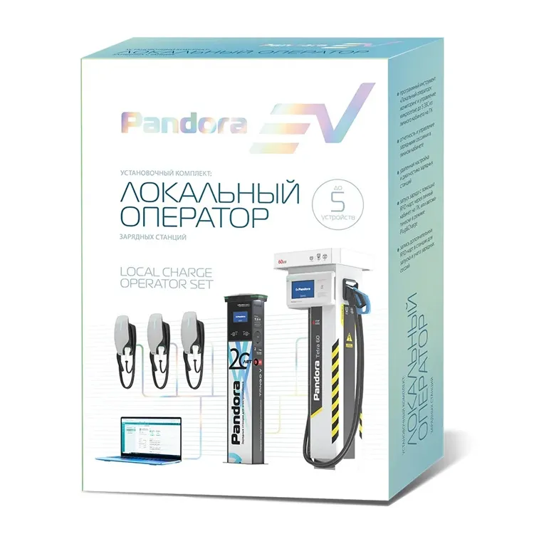 Поддерживает взаимодействие с любыми зарядным станциями Pandora. Посредством данного комплекта возможно подключение до 5 любых ЭЗС производства Pandora (лицензионный ключ может быть заменен для подключения большего количества станций).