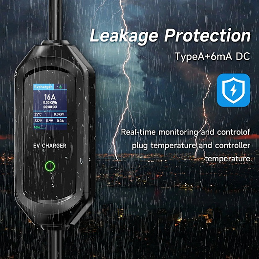 Встроены системы защиты от молний, утечек тока (Тип A DC6 мА), перенапряжения, перегрева, перегрузки по току и заземления. Кабель изготовлен из прочного материала TPE, разъем защищён по стандарту IP65 от воды и пыли.
