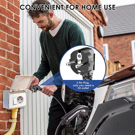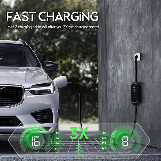 Быстрая зарядка: Работает от напряжения 110–250 В с регулируемым током до 16 А, обеспечивая максимальную мощность 3,5 кВт. Время зарядки зависит от источника питания и характеристик электромобиля.