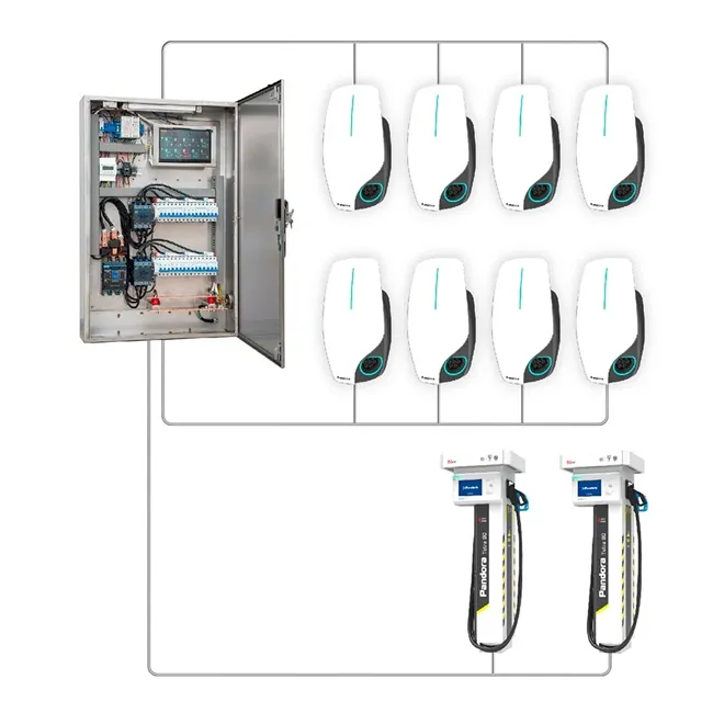 Комплект 8 зарядных станций Pandora Wall-E (AC 22 кВт) и 2 зарядных станций Pandora Tetra 80/22 с щитом балансного регулирования и распределения мощности.