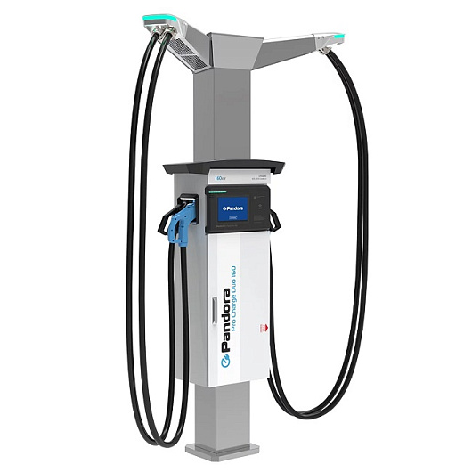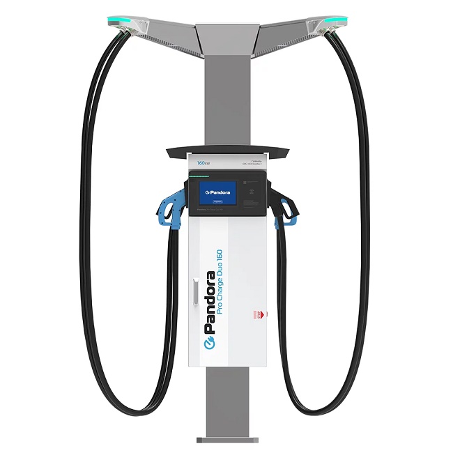Зарядная станция Pandora Pro Charge 160 DUO предназначена для быстрой зарядки электромобилей постоянным током. Максимальная выходная мощность станции 160 кВт. Зарядная станция способна одновременно заряжать два автомобиля с интерфейсами CCS Combo2 и CHAdeMO в любом сочетании, так как установлено по два зарядных пистолета с каждой стороны. Оригинальная конструкция станции позволяет разместить вокруг нее 4 парковочных места, с которых можно удобно подключить зарядный кабель.