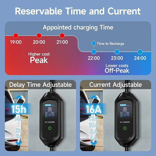 С помощью кнопки Delay вы легко зададите нужное время старта зарядки. Идеально подходит для ночной зарядки, когда тарифы на электроэнергию ниже. После полного заряда устройство автоматически отключается, поэтому вы можете оставлять его подключённым без опасений.