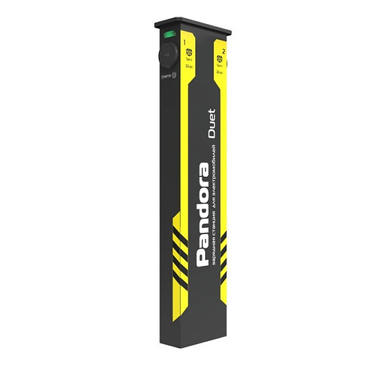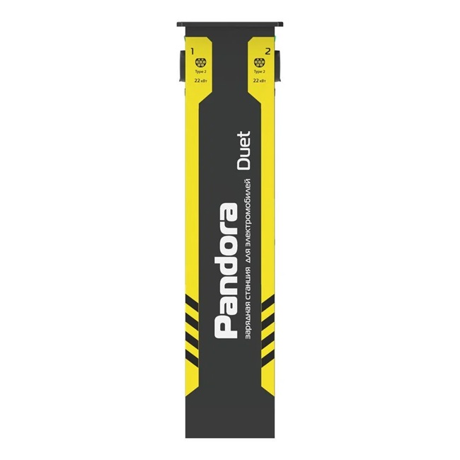 Монтаж станции возможен как на открытых площадках, так и в хорошо проветриваемых помещениях. Pandora DUET укомплектована двумя розетками стандарта Type2, опциональной возможностью комплектования зарядными кабелями «Type2 – Type2», «Type2 – GB/T AC», «Type2 – Type1», «Type2 - Tesla» и фиксацией кабеля в разъеме зарядной станции.