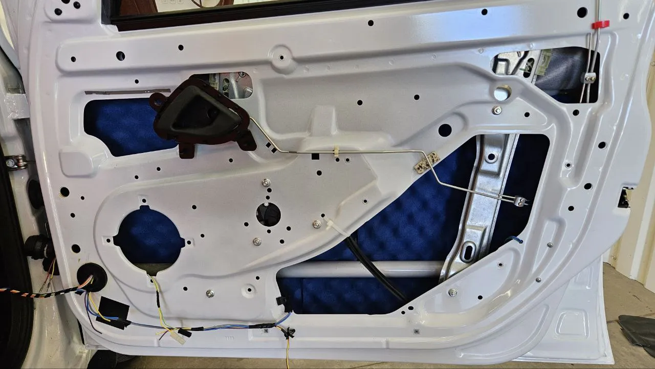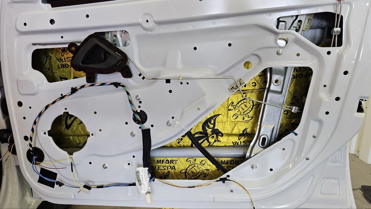 Шумо- и виброизоляция выполнена на всех четырёх дверях с использованием материалов Comfort mat: Vespa, Tsunami и Soft Wave 15. Это позволило эффективно снизить уровень дорожного шума, вибраций кузова и акустического фона, обеспечив тишину и комфорт в салоне даже на высокой скорости.