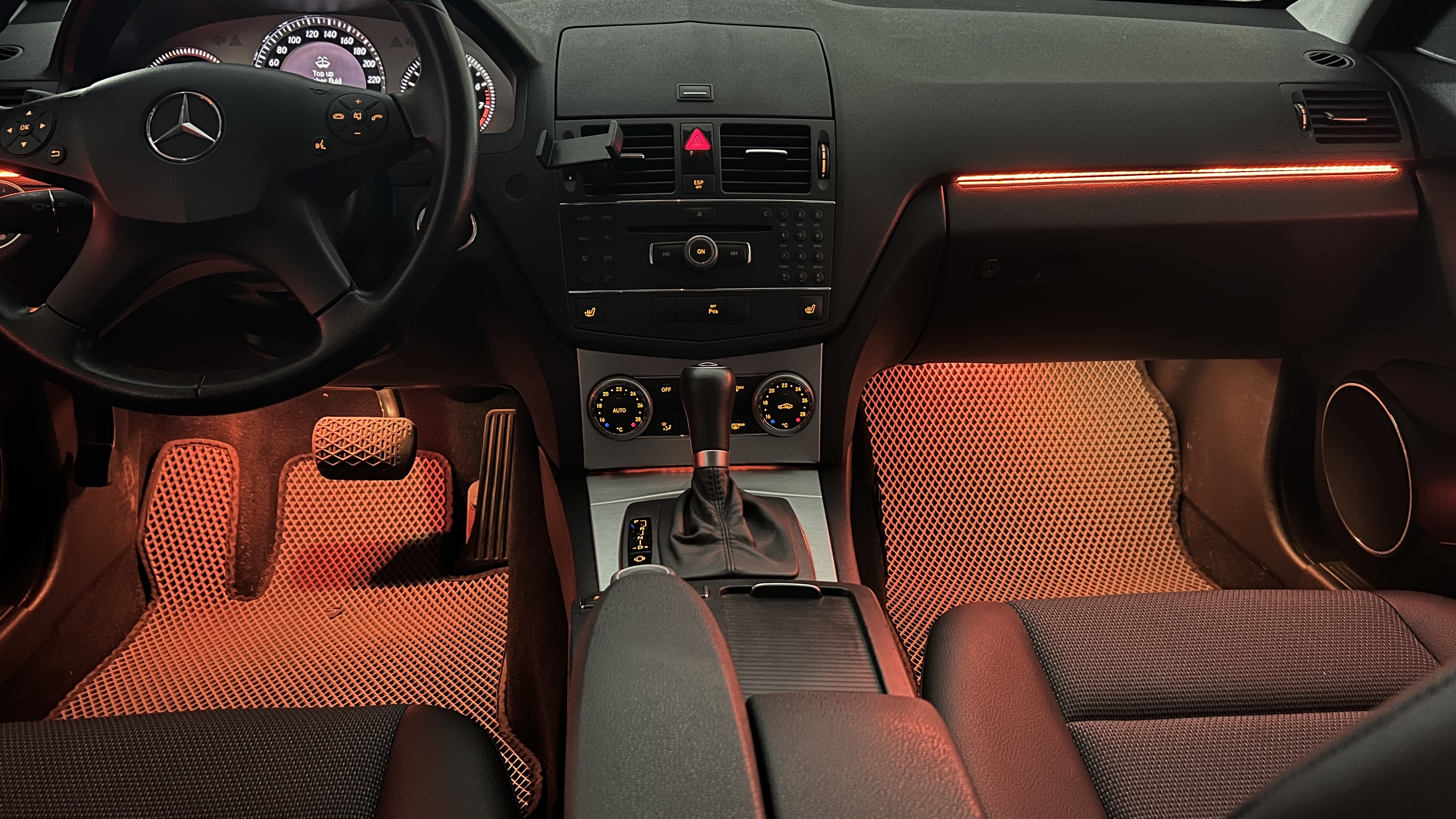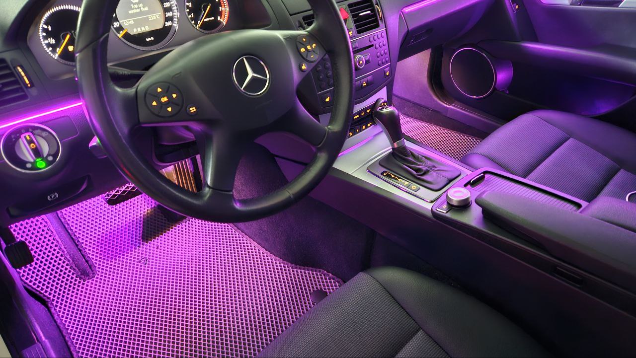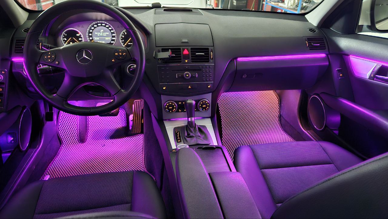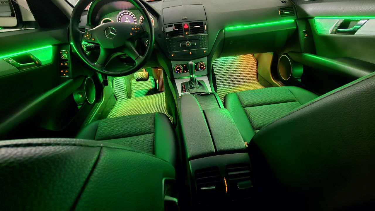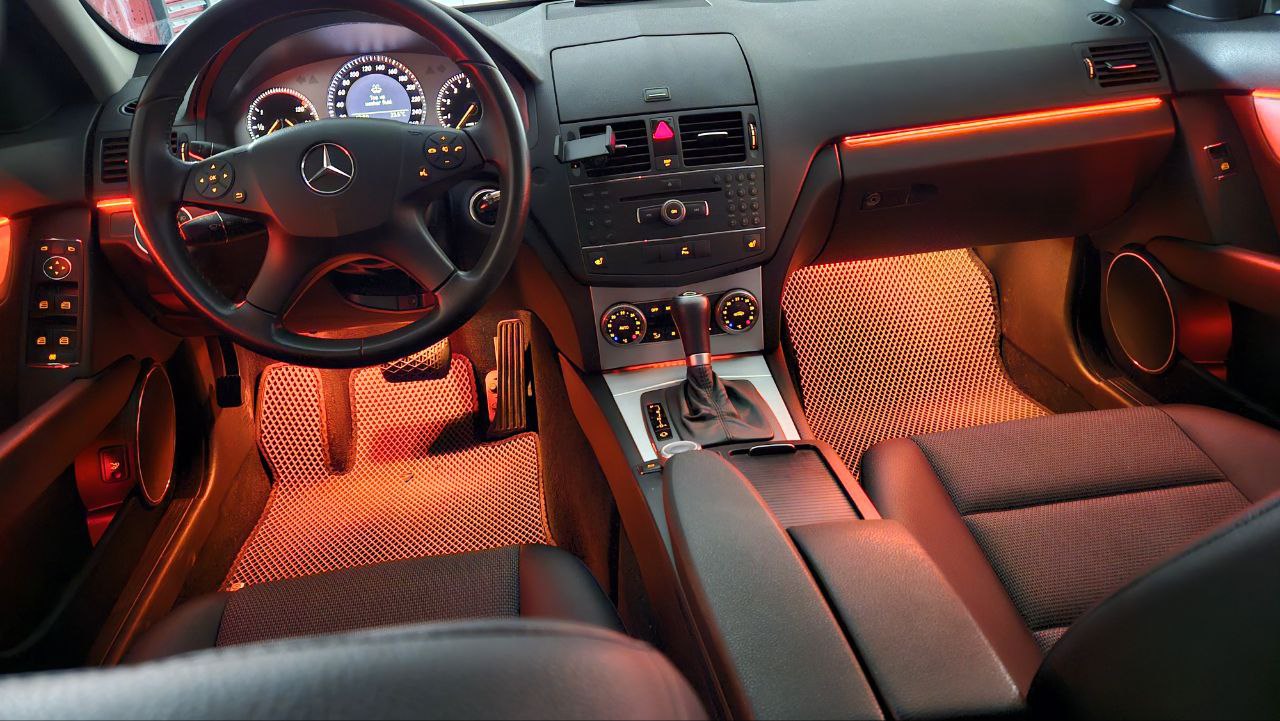 На Mercedes-Benz C class W204 2008 года была установлена современная система AMBIENT LIGHT, которая значительно преображает интерьер автомобиля. Эта атмосферная подсветка предлагает широкий выбор цветов — вы можете выбрать любой оттенок из многоцветной палитры, чтобы идеально подчеркнуть стиль салона. Кроме того, доступна настройка интенсивности света, что позволяет адаптировать подсветку под ваше настроение и предпочтения — от мягкого приглушённого свечения до яркого и выразительного эффекта.