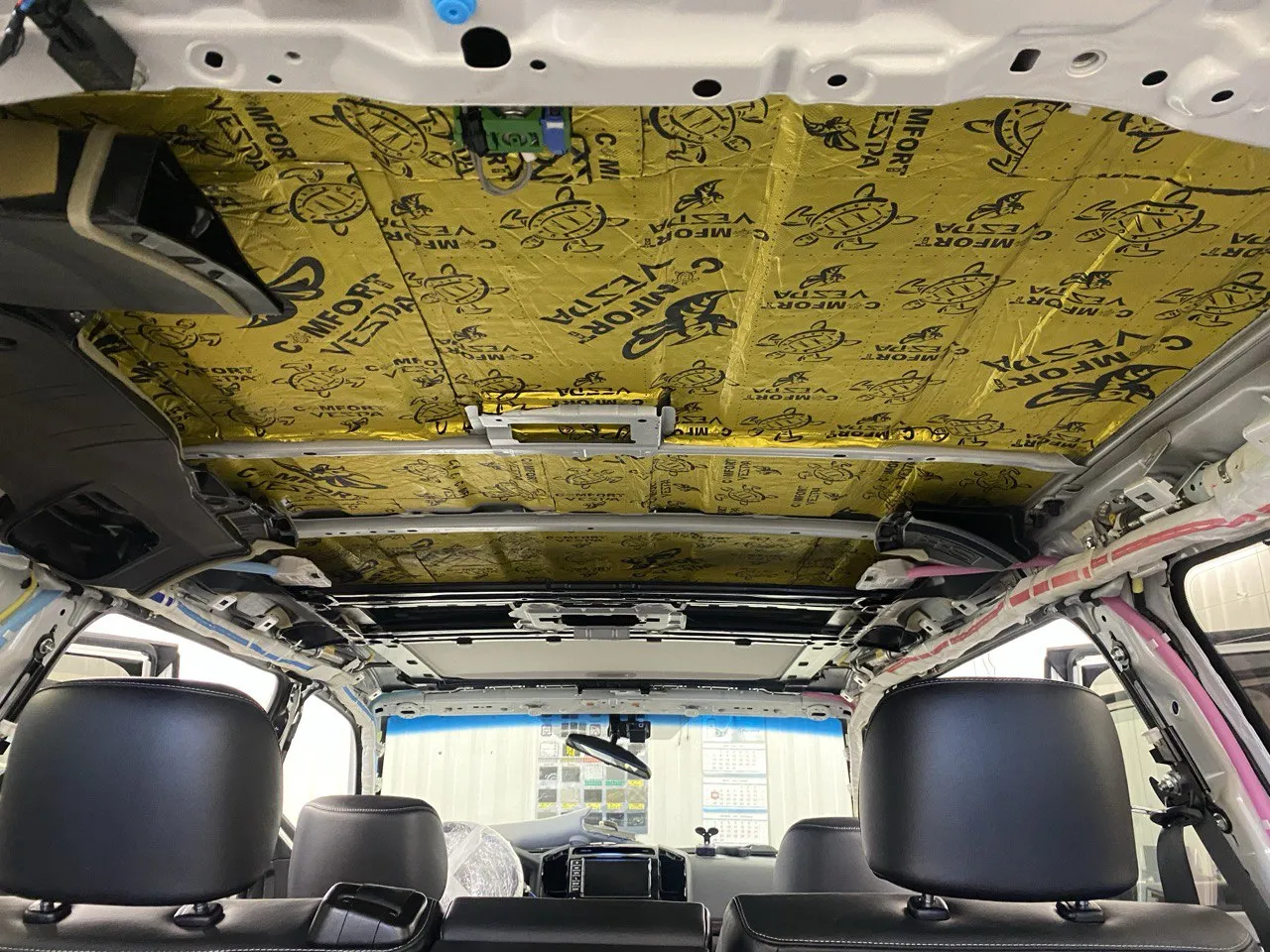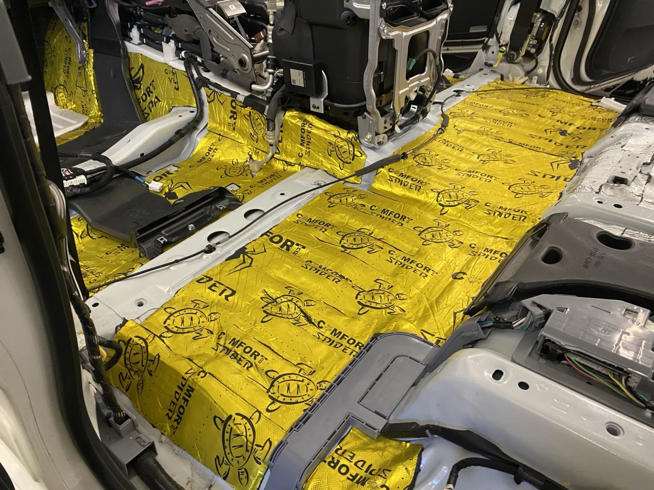 На этот раз мы провели максимально полную обработку всех ключевых зон: пол, потолок, арки, багажник и перегородка с моторным отсеком. В работе использовались передовые материалы линейки ComfortMat (Spider, Ultra Soft, Vespa, Felton, Soundtrap Green) включая новинку — инновационный многослойный материал, который состоит из лицевого покрытия из алюминиевой фольги из специального сплава SCALE ONE, тяжелой звукоизоляционной мембраны и монтажного виброакустического мастичного слоя с стохастическим распределением вспененных гранул изготовленного по технологии AEROSPACE.